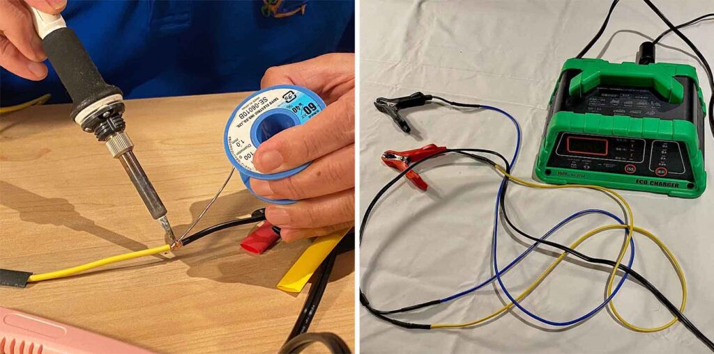 ちなみに、お借りしたkunnyさんの充電器は、本体からクリップまでのコードが短いと使いづらいというので、コードの継ぎ足し加工がされていましたが、概して規格品はなんでもが余裕がないから、この際それもマネしておこうと線の太さなども教えていただき1.25mmのコードをホームセンターから買ってきました。