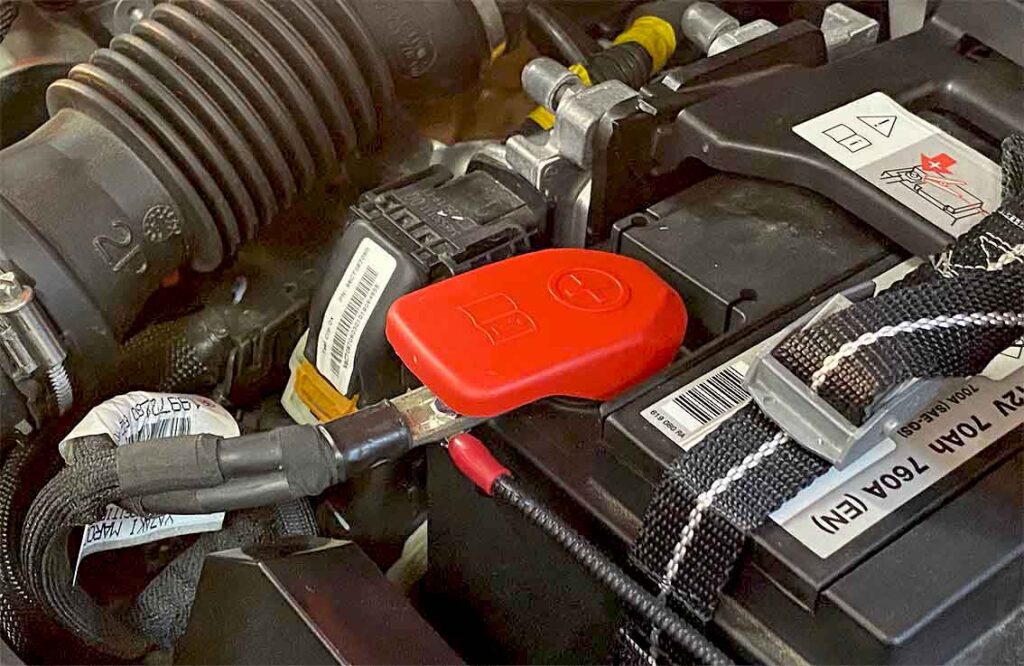 最近の車のバッテリーターミナルには下のような赤いプラスティックのカバーがありますが、そのままでは充電器のクリップが咥えにくいので、これを上に開けたのでしたが、同時にターミナルから離脱する作りになっているとも知らず、それで電気が途絶したわけでした。