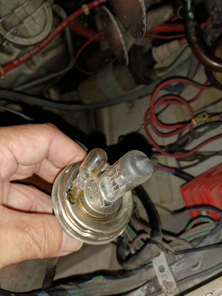 ハロゲンバルブに黄色い豆電球がくっつけてありました。当時流行したイエローバルブ風の改造でしょうか。バルブ本体はH4eという形状で、今ではあまり見かけません。
