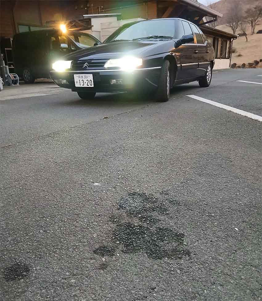 昨年末からGSばかり構っていたら、Xm嬢が職場の駐車場に緑色の大きなシミをつくってしまいました。駐車位置からすると後輪の中央辺りで漏れているようです。ハイトコレクターのL字ホースが折れたのかもしれません。