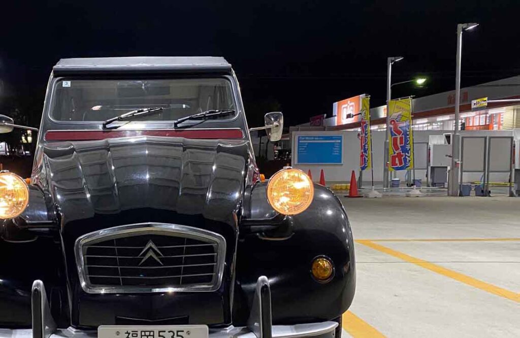 2CVは軽いから押せばスルスルと動くのですが、それでも友人は迫り来る後続車の恐怖と、人目に晒される恥ずかしさの中で必死に押してくれました。