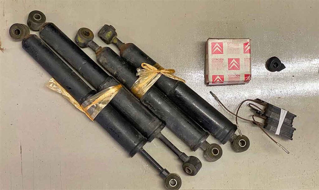 これらのパーツは、CCQの古いメンバーであるMさんにいただいたものですが、スペイン製のショックアブソーバー、ブレーキパッド2組など。線のついた方のパッドは「ディアーヌのものではないか?」とのこと。