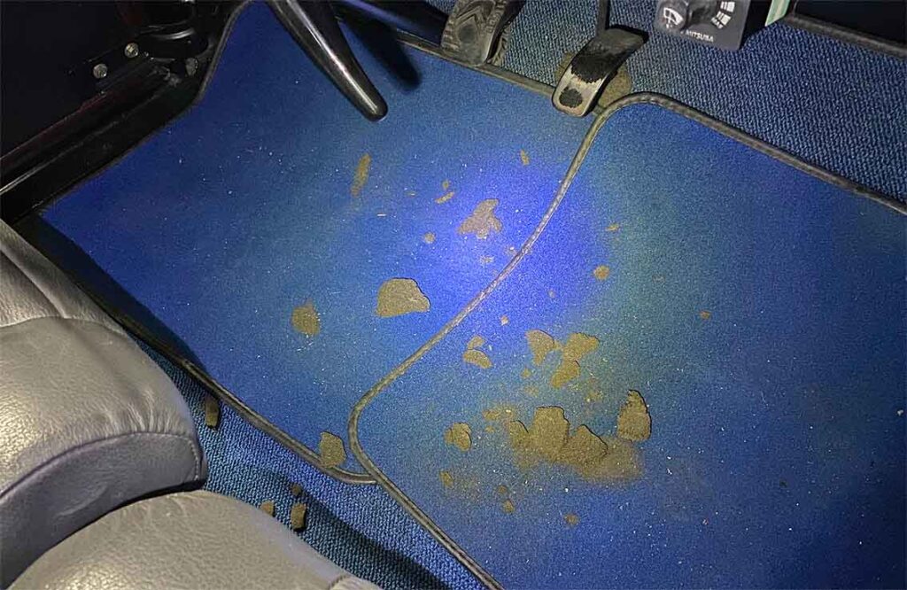後日わかったところでは、2CVのエンジンルームには紙で蛇腹のダクトが何本もあり、内側には黒いスポンジが貼られていますが、そのうちの古いのが経年でぼろぼろになり、ヒーターの季節になったことで、出口が開いて車内になだれこんできたようです。