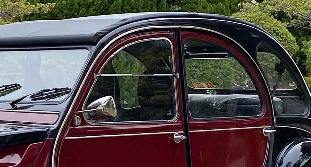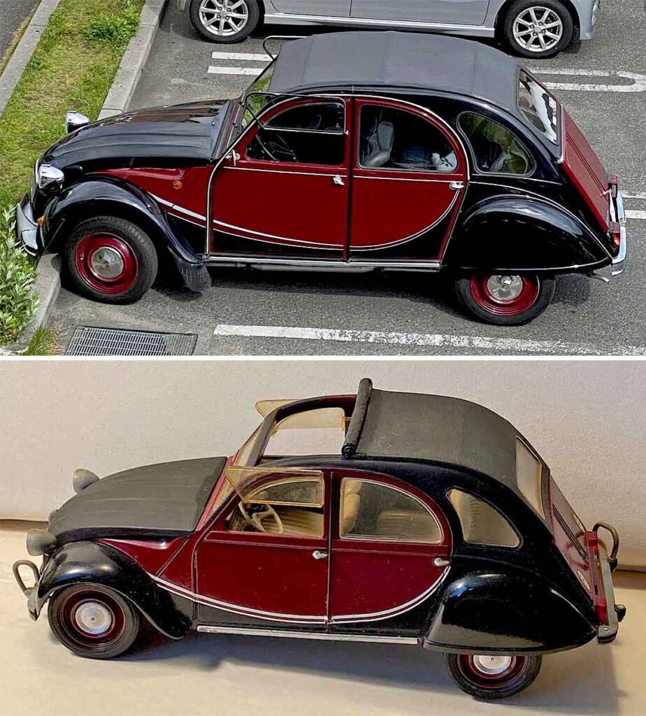こういうことで騒いでいたある日の深夜、自宅から遠くない交差点を右折しているとき赤信号側の先頭に、猫のような黄色い目を光らせた小さなライトが目に入ったから「おや?」と思ったら、なんとグレーのチャールストンが信号待ちをしていました。夏場ひっそり隠れていた2CVが、秋の虫が鳴き出すように路上に出てきて、ボディを小刻みに震わせているといった趣でした。